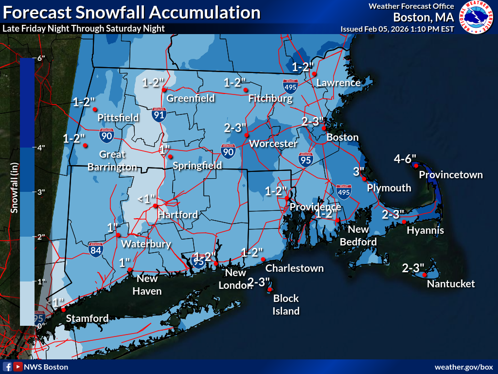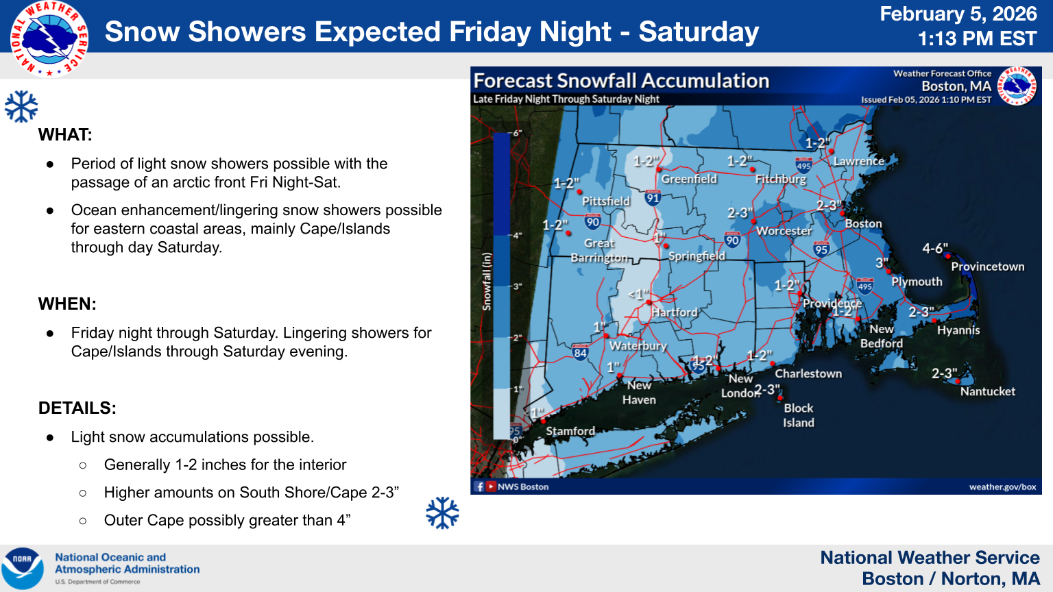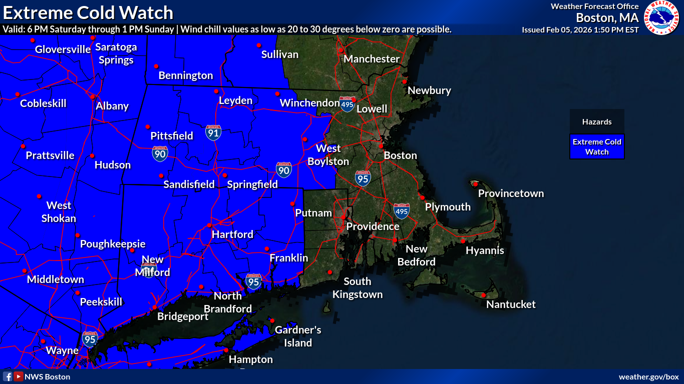 Good afternoon, Please see the attached one-page briefing regarding the dangerously cold conditions expected from Saturday night into Sunday. Wind chill values are forecast to reach 15 to 30 degrees below zero, with wind gusts up to 40 mph. Due to these conditions, the Extreme Cold Watch has been expanded across all of western and central Massachusetts, extending south into northern Connecticut. Additionally, minor snowfall is expected to begin late Friday night and continue through Saturday evening. Most areas can expect accumulations ranging from a coating to 2 inches, with totals of 2 to 3 inches possible for eastern coastal areas. Parts of the outer Cape could see greater than 4 inches. Thank you, Meteorologists Torry Dooley & Caity Mensch If you have any questions or would like more information, please don't hesitate to contact us. You can reach us via: email: box.operations@noaa.gov phone: 508.622.3280 Slack/NWSChat 2.0 <https://nwschatws.slack.com/> (for approved partners) social media: Website <http://www.weather.gov/boston> | Facebook <http://www.facebook.com/NWSBoston> | Twitter <http://www.twitter.com/NWSBoston>