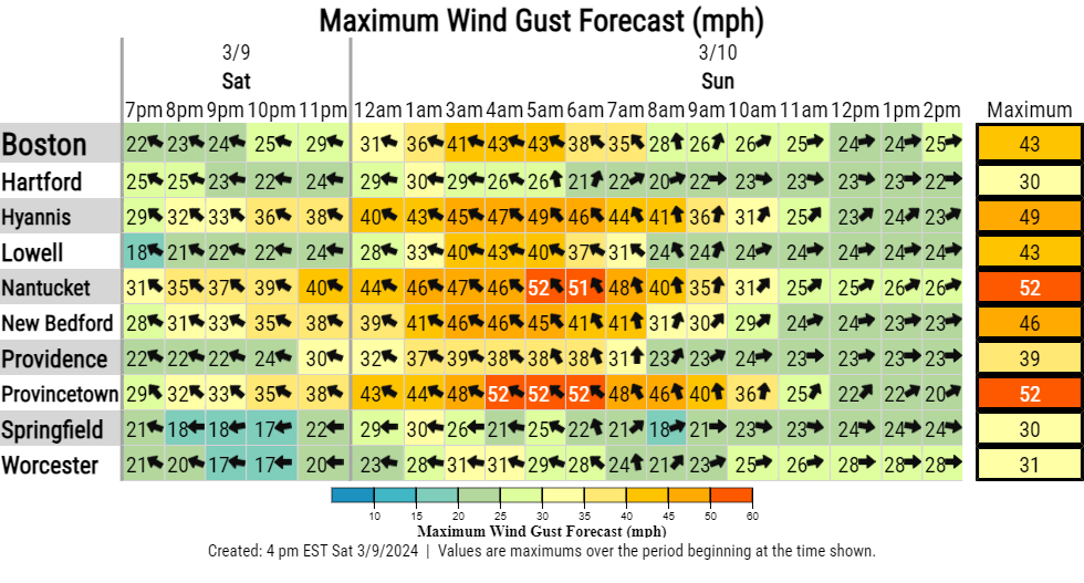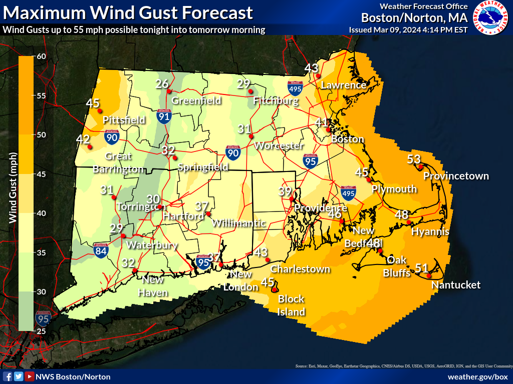 All, Apologize for the second email, however I forgot to include our one page summary and wind gust table. Sorry for any confusion and/or inconvenience. Have a great weekend. Frank Nocera If you have any questions or would like more information, please don't hesitate to contact us. You can reach us via: email: box.operations@noaa.gov phone: 508.622.3280 Slack/NWSChat 2.0 <https://nwschatws.slack.com/> (for approved partners) social media: Website <http://www.weather.gov/boston> | Facebook <http://www.facebook.com/NWSBoston> | Twitter <http://www.twitter.com/NWSBoston> ---------- Forwarded message --------- From: BOX Operations - NOAA Service Account <box.operations@noaa.gov> Date: Sat, Mar 9, 2024 at 4:22 PM Subject: [2024.03.09 PM] NWS Boston EM Briefing: Strong Winds, Heavy Rain, minor river & tidal flooding To: Good afternoon everyone, A quick hitting storm system will move across the region tonight into Sunday morning with the following impacts - Strong southeast winds gusting up to 55 mph, highest winds Cape Cod & Cape Ann, where power outages are possible. A wind advisory has been posted for the coastline of MA & RI - These strong winds combined with high astronomical tides will result in minor tidal flooding (minor inundation & coastal erosion) during the time of high tide Sunday morning & early afternoon. A coastal flood advisory has been posted for the entire coastline of MA and RI. - Heavy rain with 1-2" inches of rainfall, yielding minor street/highway flooding tonight. - With rivers and streams already swollen from heavy rain earlier this week, renewed minor flooding is possible across CT, RI and MA. Therefore, a flood watch has been posted for most of the region. Kyle Pederson, Rob Megina and Frank Nocera If you have any questions or would like more information, please don't hesitate to contact us. You can reach us via: email: box.operations@noaa.gov phone: 508.622.3280 Slack/NWSChat 2.0 <https://nwschatws.slack.com/> (for approved partners) social media: Website <http://www.weather.gov/boston> | Facebook <http://www.facebook.com/NWSBoston> | Twitter <http://www.twitter.com/NWSBoston>