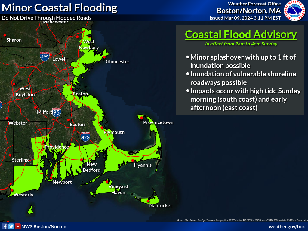 Good afternoon everyone, A quick hitting storm system will move across the region tonight into Sunday morning with the following impacts - Strong southeast winds gusting up to 55 mph, highest winds Cape Cod & Cape Ann, where power outages are possible. A wind advisory has been posted for the coastline of MA & RI - These strong winds combined with high astronomical tides will result in minor tidal flooding (minor inundation & coastal erosion) during the time of high tide Sunday morning & early afternoon. A coastal flood advisory has been posted for the entire coastline of MA and RI. - Heavy rain with 1-2" inches of rainfall, yielding minor street/highway flooding tonight. - With rivers and streams already swollen from heavy rain earlier this week, renewed minor flooding is possible across CT, RI and MA. Therefore, a flood watch has been posted for most of the region. Kyle Pederson, Rob Megina and Frank Nocera If you have any questions or would like more information, please don't hesitate to contact us. You can reach us via: email: box.operations@noaa.gov phone: 508.622.3280 Slack/NWSChat 2.0 <https://nwschatws.slack.com/> (for approved partners) social media: Website <http://www.weather.gov/boston> | Facebook <http://www.facebook.com/NWSBoston> | Twitter <http://www.twitter.com/NWSBoston>