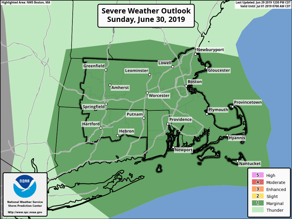 Good evening everyone The threat for additional strong thunderstorms will be winding down this evening. However, another round of strong to severe thunderstorms is expected on Sunday and we have included a brief outline and graphic to this email. *WHAT/WHEN:* - Scattered strong to perhaps severe thunderstorms expected from mid to late Sunday morning into Sunday afternoon. *WHERE:* *- *All of southern New England is at risk, especially central and eastern MA as well as Rhode Island. *POTENTIAL IMPACTS:* - Hail is the main threat with Sunday's thunderstorms. Some hail may become large and reach or exceed the size of a quarter. - Any thunderstorm will be capable of producing 1+ inches of rain in a short period of time. This will bring the potential for localized street flooding. - Locally strong to perhaps damaging wind gusts are a secondary concern. - Dangerous cloud to ground lightning will pose a risk to those with outdoor activities, including mariners and beachgoers. Please let us know if you have any questions or concerns. Thank You Meteorologist: Hayden Frank If you have any questions or would like more information, don't hesitate to contact us via this email address, on NWSChat <https://nwschat.weather.gov/>, or at the following: National Weather Service Boston/Norton, MA 46 Commerce Way Norton, MA 02766 508.622.3280 Website <http://www.weather.gov/boston> | Facebook <http://www.facebook.com/NWSBoston> | Twitter <http://www.twitter.com/NWSBoston>