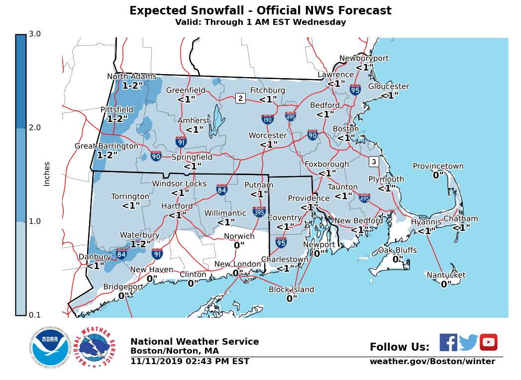 Good afternoon, Expectations for wintry weather have changed slightly Tuesday into Tuesday evening. The colder air is now thought to arrive more quickly, meaning a lesser risk for freezing rain. Our current forecast has rain briefly mixing with snow, before changing to snow, from west to east. The timing for this changeover to snow should be towards mid morning along and west of the Connecticut River in MA, to around noon in central MA and northeast CT, to mid afternoon along the I-95 corridor in MA and RI. Snowfall is expected to end along and west of the I-95 corridor in MA and RI by 6-7 PM. This means some light snow may impact the Tuesday afternoon commute across eastern MA and RI. Snow amounts are still expected to be light, generally a coating to an inch of snow is likely. Please see the attached snowfall map for more details. The other concern early this week will be the cold Tuesday night through Wednesday night. Slightly higher temperatures through the rest of this work week, but still below normal. Minimum wind chill values mainly 0-10 above zero across southern New England, ranging to 0 to 10 below zero across the higher terrain of the Berkshires and northwest CT. Matthew Belk If you have any questions or would like more information, don't hesitate to contact us via this email address, on NWSChat <https://nwschat.weather.gov/>, or at the following: National Weather Service Boston/Norton, MA 46 Commerce Way Norton, MA 02766 508.622.3280 Website <http://www.weather.gov/boston> | Facebook <http://www.facebook.com/NWSBoston> | Twitter <http://www.twitter.com/NWSBoston>