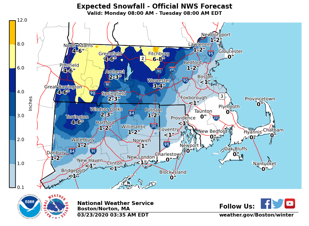 Good morning everyone, Here is the latest thinking about the coastal storm which will pass southeast of New England today into early Tuesday. It will bring snow to much of the area this afternoon before a change to rain Monday night. This is expected to be a minor snowfall event, with the exception of the higher elevations of western and central MA, where as much as 8 inches of snow is possible. *NEW:* - Northwest Middlesex County changed from a Winter Weather Advisory to a Winter Storm Warning *What/Where/When:* - Snow develops from west to east across much of southern New England Monday afternoon, except near the South Coast, Cape Cod, and the Islands where mainly rain is expected. - Snow is expected to be heavy at times late Monday afternoon into evening, especially in the Berkshires and northern Worcester Hills. Heavy snowfall rates could lead to snow-packed roads and difficult travel. - Snow mixes with and changes over to rain from south to north. The higher elevations of northern Worcester County and the Berkshires are expected to remain mostly snow. - The consistency of the snow will be heavy and wet. *Uncertainty:* - Snow amounts will be highly elevation-dependent, leading to potentially significant countywide differences in snow totals. - Portions of northwest Hartford County may see 3-5" with quickly diminishing amounts to the south and east. - If the coastal storm passes farther offshore, snowfall totals will be less, especially across the interior. - Conversely, if the storm tracks closer to southern New England, there would be less snow across most of the region, since the higher accumulations would shift to the northwest of MA. For more details, check out our winter page: https://www.weather.gov/box/winter Thank you Bryce Williams and Bill Babcock If you have any questions or would like more information, don't hesitate to contact us via this email address, on NWSChat <https://nwschat.weather.gov/>, or at the following: National Weather Service Boston/Norton, MA 46 Commerce Way Norton, MA 02766 508.622.3280 Website <http://www.weather.gov/boston> | Facebook <http://www.facebook.com/NWSBoston> | Twitter <http://www.twitter.com/NWSBoston>