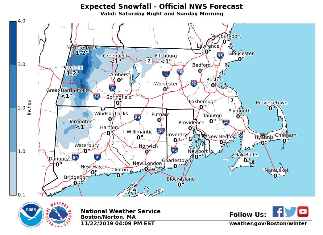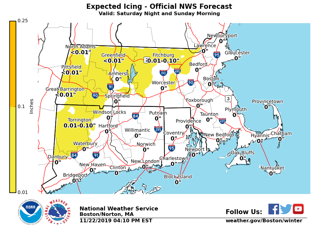 We continue to monitor two weather systems this weekend for possible hazardous weather. There have been a couple of changes since this morning: *Tonight:* Strong west winds tonight follow a cold front that moved through during the afternoon and evening. This will mainly affect the marine community. *Marine Impacts: Gale Force Winds* *Locations*: Massachusetts and Rhode Island coastal waters *Timing:* Onset of Gales between 4 and 7 PM, ending between 4 and 8 AM Saturday. *Wind Gusts:* W 30 to 40 knots, peaking between 8 PM and 2 AM. *Seas:* 4 to 7 feet on the inner bays and sounds; 7 to 11 ft offshore. *Impact:* Hazardous conditions for mariners. *Uncertainty:* High confidence. *Saturday Night and Sunday:* Low pressure is expected to track near Nantucket. As rain overspreads the region Saturday night, it will be cold enough for a wintry mix across parts of the interior with the potential for light icing and impacts to travel. Milder air will cause a change to rain Sunday morning. *Interior Light Icing and Light Snow (See Attached Images):* *Locations*: Western and Central Massachusetts, possibly northwest Hartford County, CT, especially in the higher elevations. *Timing:* Wintry mix of snow and light freezing rain late Saturday night into early Sunday morning, changing to rain by late morning or early afternoon. *Impact*: Slippery travel. Snow and ice amounts will be light, with up to two inches of snow in the higher elevations and a light coating (up to 1/10") of ice. *Uncertainty:* Timing of the exact changeover. *Minor Coastal Flooding: Sunday Morning High Tide* *Locations*: Eastern Massachusetts coast (including Martha's Vineyard and Nantucket) and the South Coast *Timing:* Sunday morning high tide (5:41 AM at Providence, 8:45 AM at Boston, and 9:46 AM on Nantucket) *Storm Surge:* 1.0 to 1.5 feet *Inundation:* Less than 1 foot above ground level *Impact*: Some vulnerable shoreline roads may become temporarily impassable around high tide. *Uncertainty:* High. Timing of highest surge may not coincide with high tide, which would lead to little or no impact. Minor coastal flooding would be the worst case scenario. *Minor Coastal Flooding: Sunday Evening High Tide* *Locations*: Eastern Massachusetts coast including Martha's Vineyard and Nantucket *Timing:* Sunday evening high tide (9:17 PM at Boston and 10:24 PM on Nantucket) *Storm Surge:* Around 2.0 feet *Inundation:* Up to 1 foot above ground level *Impact*: Some vulnerable shoreline roads may become temporarily impassable around high tide. *Uncertainty:* Lower than with the morning high tide. Locations along the Bay side of Cape Cod, Plymouth County, and Nantucket are most vulnerable. If you have any questions or would like more information, don't hesitate to contact us via this email address, on NWSChat <https://nwschat.weather.gov/>, or at the following: National Weather Service Boston/Norton, MA 46 Commerce Way Norton, MA 02766 508.622.3280 Website <http://www.weather.gov/boston> | Facebook <http://www.facebook.com/NWSBoston> | Twitter <http://www.twitter.com/NWSBoston>