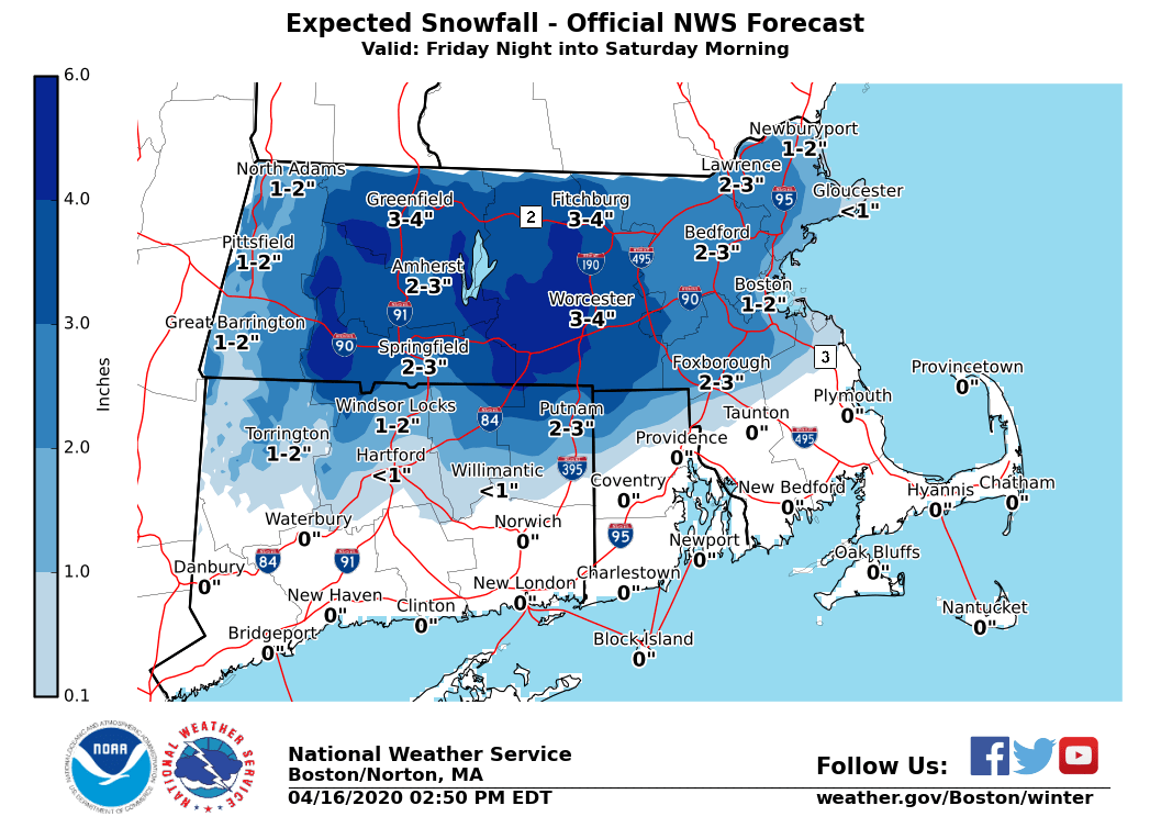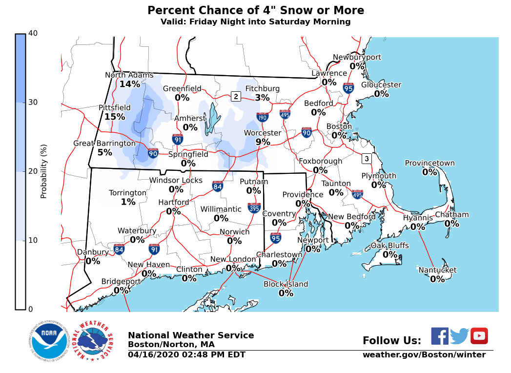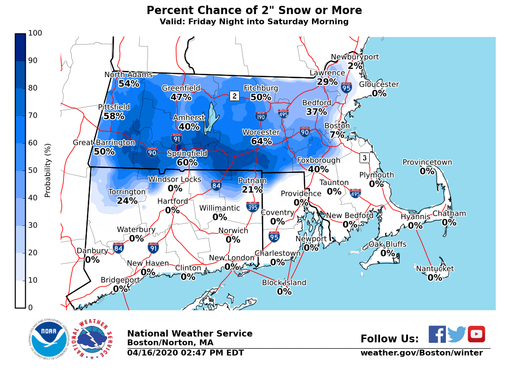 Good afternoon, We are closing tracking the potential for accumulating snowfall Friday night into Saturday morning. Confidence is not high enough to support any winter weather headlines, but they could be issued in later forecasts. We've attached graphics which include expected snowfall total and the chances of receiving 2 or more inches, and 4 or more inches of snow. *Details:* Light rain will develop across western Massachusetts late in the day Friday with precipitation overspreading Southern New England Friday evening. With cooler air moving south we will slowly change over to snow across Friday night, except across southern Rhode Island and southeast Massachusetts where mainly rain is expected. The steadiest of the snow will fall across the border of Massachusetts and Connecticut/Rhode Island, then points north towards the Mass Pike and Route 2. Snow wraps up early Saturday morning before turning back over to light rain showers. *What:* Accumulation of wet/heavy snow. Generally 2 to 4 inches [near and north of the Mass Pike], with the highest snow totals to each 4-5" across the Berkshires. *Where:* Most of Massachusetts, northern Connecticut, northwestern Rhode Island. *When:* Rain changes over to snow from west to east after 8 p.m. and continues until early Saturday morning. *Impacts:* - Power outages possible from wet/heavy snow and tree/limb damage [where more than 4 inches of snowfall occurs]. - Slushy/icy untreated surfaces and secondary roads across higher terrain. *Confidence: *We are most confident in snowfall totals along and north of the Mass Pike. There is some uncertainty with snowfall totals in northern Connecticut and northwest Rhode Island where snowfall totals could end up lower than currently forecasted. **Note:* Please consider the snow accumulation as *preliminary* and are subject to further adjustments. Meteorologists: Kevin Cadima, Joe Dellicarpina, & Torry Gaucher If you have any questions or would like more information, don't hesitate to contact us via this email address, on NWSChat <https://nwschat.weather.gov/>, or at the following: National Weather Service Boston/Norton, MA 46 Commerce Way Norton, MA 02766 508.622.3280 Website <http://www.weather.gov/boston> | Facebook <http://www.facebook.com/NWSBoston> | Twitter <http://www.twitter.com/NWSBoston>