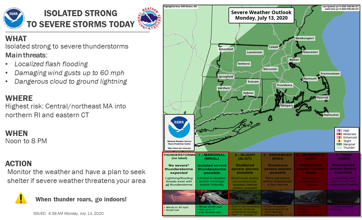 Good morning, We continue to expect isolated strong to severe thunderstorms to impact portions of southern New England this afternoon and evening. Details below: *Threats:* - Damaging winds - Flash flooding *Timing: * - Noon to 8pm *Location: * - Highest risk: Central/northeast MA into northern RI and eastern CT If you have any questions or would like more information, don't hesitate to contact us via this email address, on NWSChat <https://nwschat.weather.gov/>, or by phone at 508.622.3280. Thanks, Bryce Williams and Bill Leatham If you have any questions or would like more information, don't hesitate to contact us via this email address, on NWSChat <https://nwschat.weather.gov/>, or at the following: National Weather Service Boston/Norton, MA 46 Commerce Way Norton, MA 02766 508.622.3280 Website <http://www.weather.gov/boston> | Facebook <http://www.facebook.com/NWSBoston> | Twitter <http://www.twitter.com/NWSBoston>