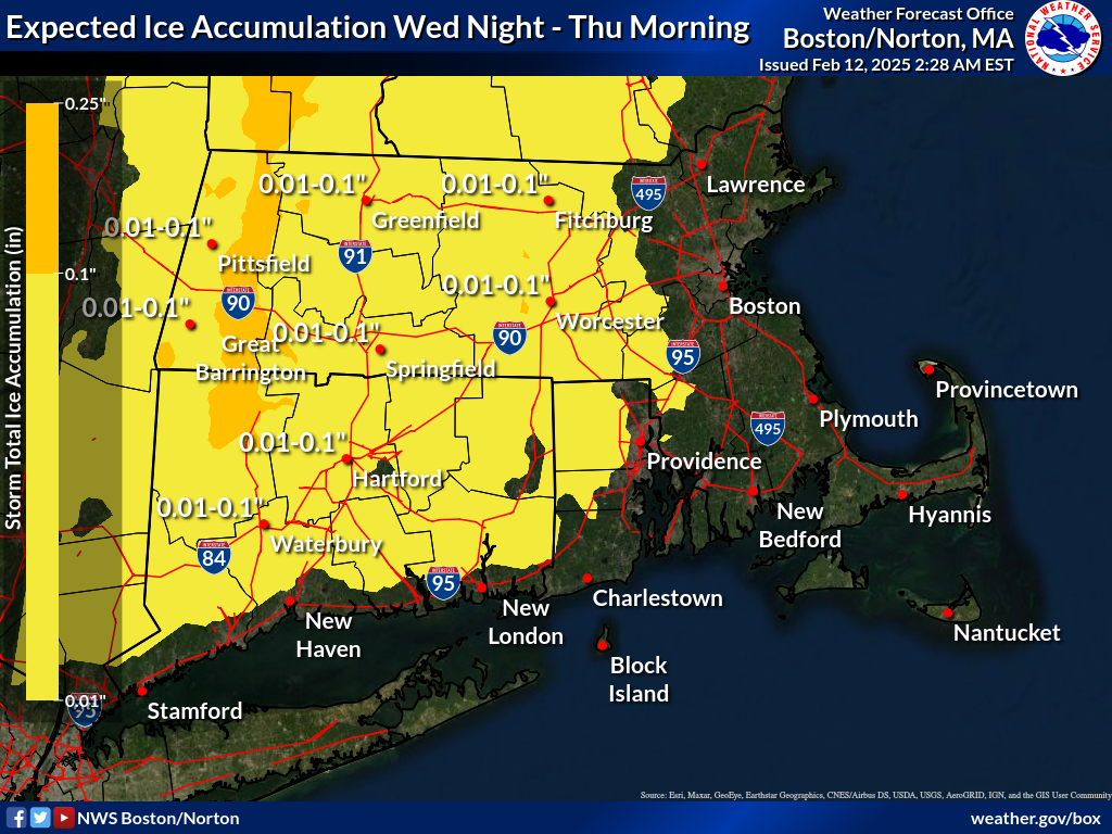 Good morning, Here is the updated forecast for snow and freezing rain expected tonight into Thursday morning. There has been little change to the forecast. If you have any questions, please don't hesitate to reach out to us. Thank you, Bryce Williams and Caity Mensch email: box.operations@noaa.gov phone: 508.622.3280 Slack/NWSChat 2.0 <https://nwschatws.slack.com/> (for approved partners) social media: Website <http://www.weather.gov/boston> | Facebook <http://www.facebook.com/NWSBoston> | Twitter <http://www.twitter.com/NWSBoston>