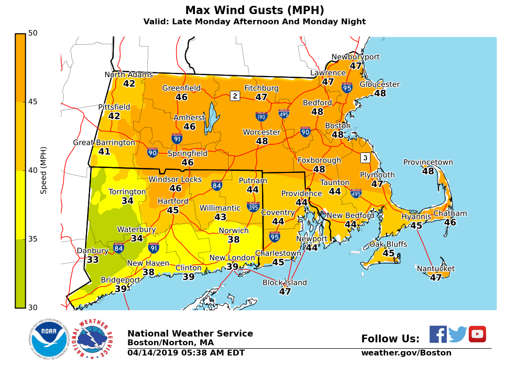 Good morning everyone We just wanted to let you know that a Wind Advisory has been issued beginning early Monday evening and continuing into the overnight hours for western, central, and portions of eastern Massachusetts. This is for northwest wind gusts of 35 to 50 mph that are expected to develop behind a strong cold front. It is possible that the Wind Advisory might need to be expanded with later forecasts. Attached is the image showing where the Wind Advisory is currently in effect. The second graphic shows the expected maximum wind gusts late Monday into Monday night. Please let us know if you have any questions or concerns. Thank You Meteorologist: Hayden Frank If you have any questions or would like more information, don't hesitate to contact us via this email address, on NWSChat <https://nwschat.weather.gov/>, or at the following: National Weather Service Boston/Norton, MA 46 Commerce Way Norton, MA 02766 508.622.3280 Website <http://www.weather.gov/boston> | Facebook <http://www.facebook.com/NWSBoston> | Twitter <http://www.twitter.com/NWSBoston>