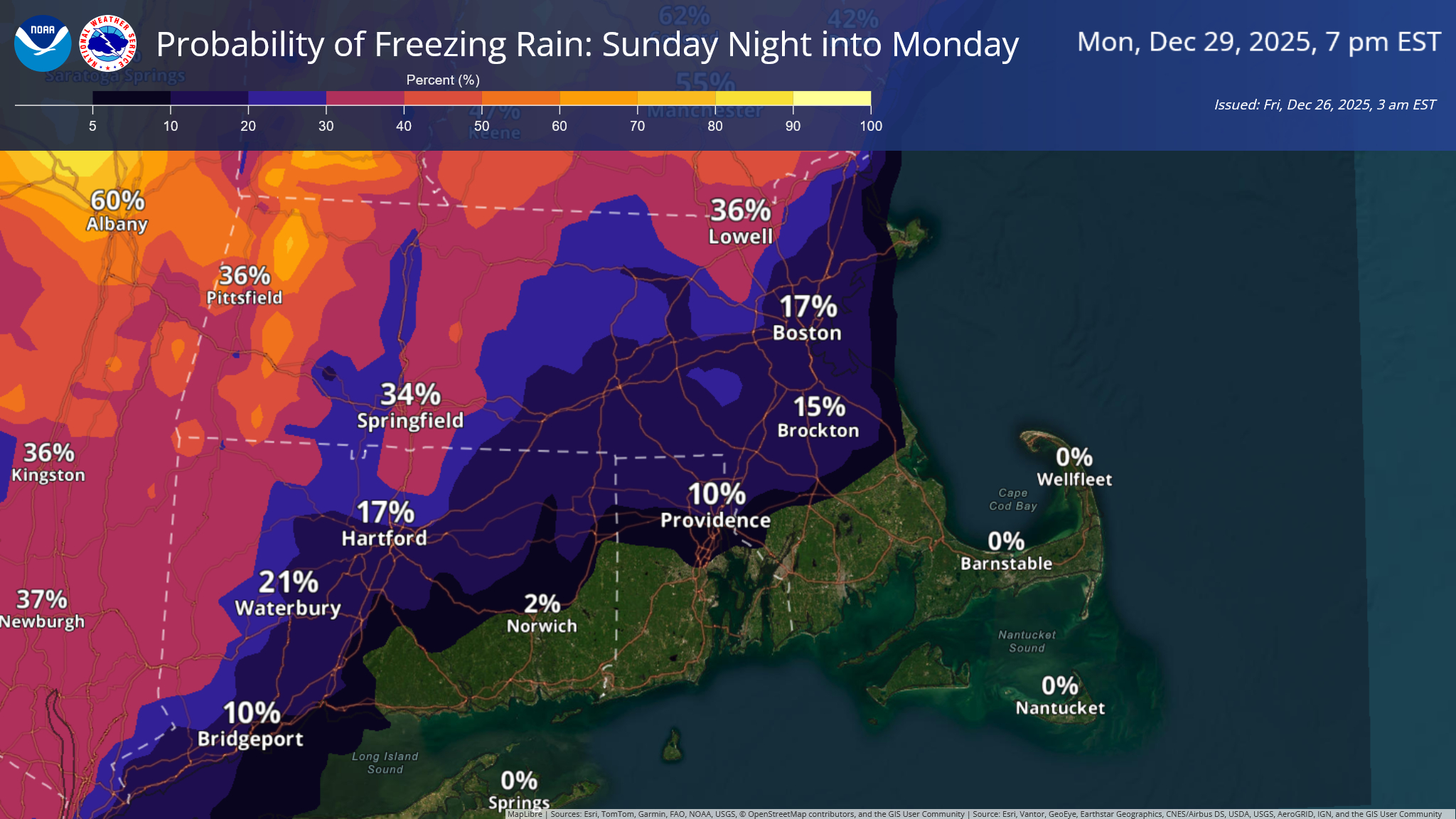 Good morning, A clipper system is expected to bring accumulating snowfall across western Massachusetts, all of Connecticut, and into southern Rhode Island from Friday night through Saturday morning. Eastern portions of southern New England will also see snow, though amounts are expected to be lower. *Current confidence* Forecast confidence remains *moderate*. The primary challenge remains a narrow snowfall gradient, where subtle shifts in the system track will result in notable differences in snowfall totals. *What’s changed since Yesterday* A Winter Weather Advisory has been expanded into western MA, all of CT, and southern portions of RI. *Timing* - Snow moves west to east Friday evening, generally between 7 PM and 10pm. - Along the eastern Massachusetts coast, light snow may begin between midnight and 2 AM. - Heaviest snow rates expected between 8pm-2am with lingering snow showers until 7am Saturday. *Accumulations* - *Greatest confidence in impactful snowfall:* Central and western Connecticut and western Massachusetts into southern Rhode Island - Snowfall amounts: 2–4", with localized totals up to 5-6 mainly in Connecticut" - *Lower snowfall amounts:* Central/eastern Massachusetts - Snowfall amounts: a coating up to 2" *Post-event* Drier conditions are expected late Saturday into Sunday. Another system may bring a threat of freezing rain late Sunday evening into early Monday morning. An attached image highlights areas with the greatest potential for freezing rain, mainly across interior southern New England. While details remain limited, we wanted to raise awareness as the busy holiday weekend concludes. Additional information will be provided as confidence increases. Thank you, *Meteorologist:* Kyle Pederson If you have any questions or would like more information, please don't hesitate to contact us. You can reach us via: email: box.operations@noaa.gov phone: 508.622.3280 Slack/NWSChat 2.0 <https://nwschatws.slack.com/> (for approved partners) social media: Website <http://www.weather.gov/boston> | Facebook <http://www.facebook.com/NWSBoston> | Twitter <http://www.twitter.com/NWSBoston>