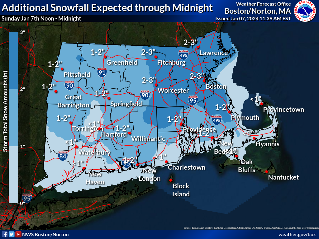 Good morning all, We just wanted to send along a quick update with an "additional snowfall" graphic. You'll find attached the expected additional snow through midnight, generally 1 to 3 inches. Let us know if you have any questions! Bryce Williams, Kristie Smith, and Joe Dellicarpini If you have any questions or would like more information, please don't hesitate to contact us. You can reach us via: email: box.operations@noaa.gov phone: 508.622.3280 Slack/NWSChat 2.0 <https://nwschatws.slack.com/> (for approved partners) social media: Website <http://www.weather.gov/boston> | Facebook <http://www.facebook.com/NWSBoston> | Twitter <http://www.twitter.com/NWSBoston>