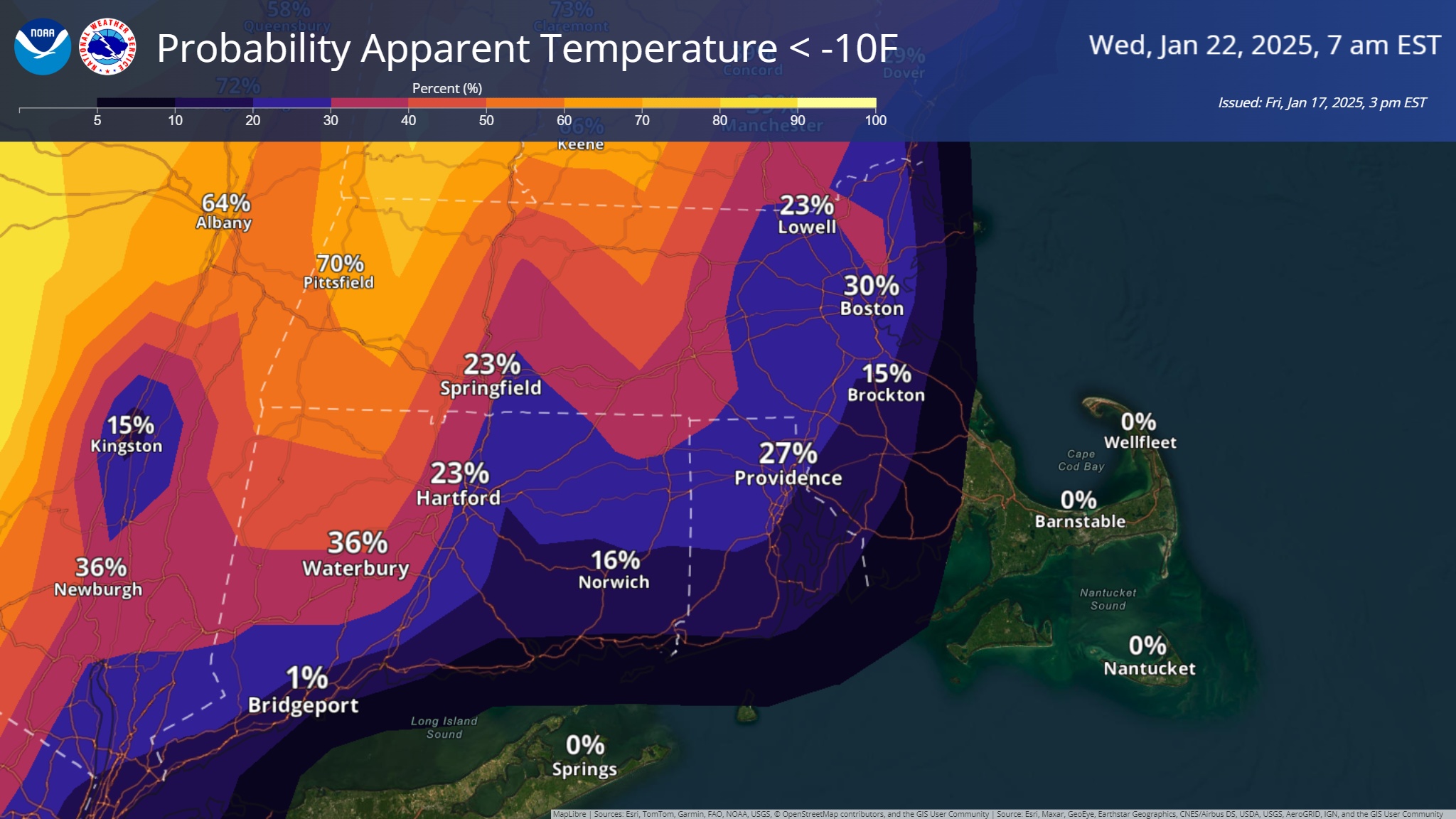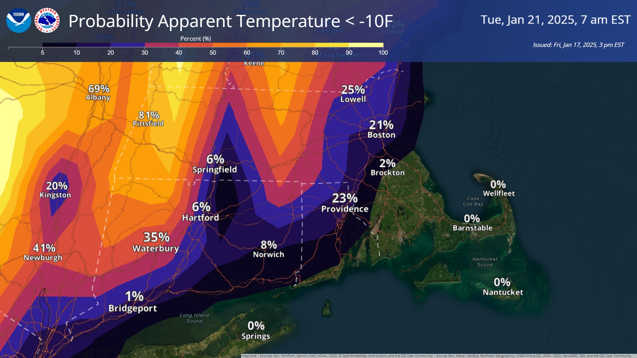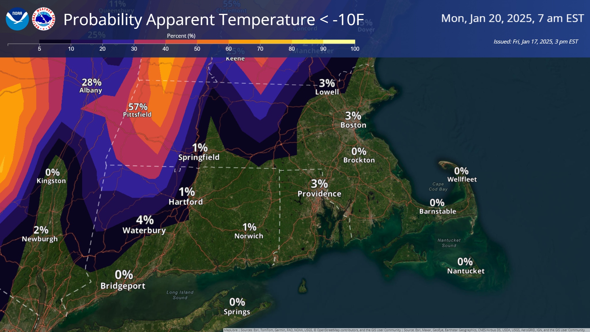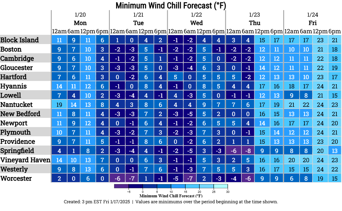 Good afternoon everyone, Here is the latest update regarding the potential snowfall late Sunday, Sunday night into early Monday morning and the bitterly cold weather to follow early next week. *Snow Potential...* - Snow arrives Sunday afternoon, with the steadiest and heaviest snow Sunday evening and overnight, then tapering off early Monday morning. - Still 2 days away, so uncertainty on exact location of the rain/snow line, areas of heaviest snow bands and exact snow amounts. - The potential exists for 4-8" of snow in the watch area, with locally higher amounts possible, depending on the location and duration of heavier snow bands. Less snow is expected along and south of the rain/snow line, location to be determined. - Attached is a graphic with the winter storm/winter weather advisory configuration. *Bitter Cold...* - Core of the coldest air is from Monday night into Wednesday night. - Daytime highs only 15-20F and nighttime lows -5F to +5F - Wind chills as cold as zero to -10F, possibly as cold as -20F in the Berkshires - Wind chill graphics attached Meteorologists Andrew Loconto, Matt Belk and Frank Nocera If you have any questions or would like more information, please don't hesitate to contact us. You can reach us via: email: box.operations@noaa.gov phone: 508.622.3280 Slack/NWSChat 2.0 <https://nwschatws.slack.com/> (for approved partners) social media: Website <http://www.weather.gov/boston> | Facebook <http://www.facebook.com/NWSBoston> | Twitter <http://www.twitter.com/NWSBoston>