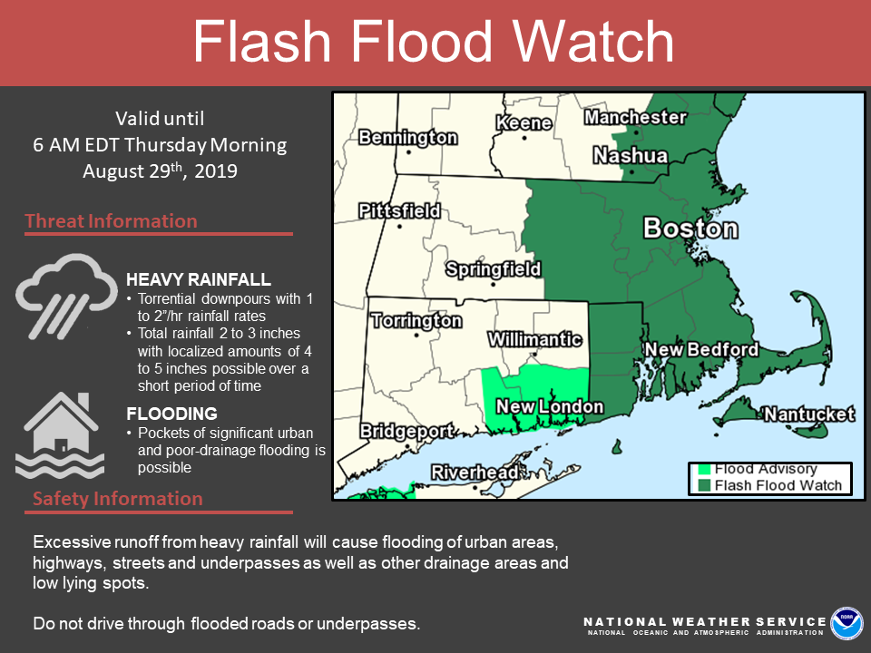 Good afternoon, There are no changes to the forecast regarding the heavy rainfall and risk of flash flooding. A FLASH FLOOD WATCH continues for central/eastern MA and RI where confidence is highest for heavy rainfall and localized flash flooding. Details below. *What:* - Heavy rainfall with rainfall rates 1-2 inches/per hour - Total rainfall of 2 to 3 inches, with localized amounts of 4 to 5 inches over a short period of time - Pockets of significant urban and poor drainage flooding possible - Low risk for an isolated severe storm *Where:* - The greatest risk across eastern MA and RI, but axis of heavy rainfall may still shift slightly *When:* - Heaviest rainfall will be tonight through the early morning hours - Best chance for an isolated severe storm will be tonight *Uncertainty:* - The heaviest rainfall amounts and potential flooding will be localized, and thus amounts will vary considerably over short distances. However, the greatest confidence lies within the Flash Flood Watch area. If you have any questions or would like more information, don't hesitate to contact us via this email address, on NWSChat <https://nwschat.weather.gov/>, or at the following: National Weather Service Boston/Norton, MA 46 Commerce Way Norton, MA 02766 508.622.3280 Website <http://www.weather.gov/boston> | Facebook <http://www.facebook.com/NWSBoston> | Twitter <http://www.twitter.com/NWSBoston>