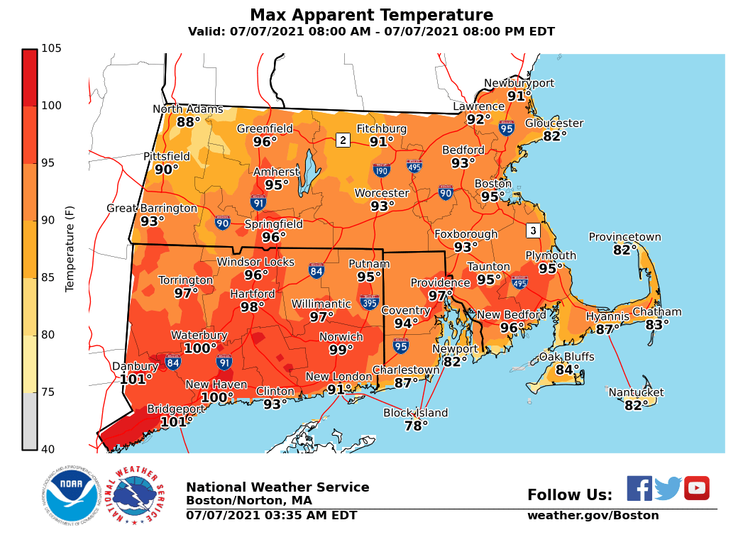 Good morning, Attached is the latest briefing about the severe weather risk across southern New England today. The oppressive heat continues away from the south coast and we have attached the heat indices expected today. Thank you, Meteorologists Bill Leatham and Frank Nocera If you have any questions or would like more information, don't hesitate to contact us via this email address, on NWSChat <https://nwschat.weather.gov/>, or at the following: National Weather Service Boston/Norton, MA 46 Commerce Way Norton, MA 02766 508.622.3280 Website <http://www.weather.gov/boston> | Facebook <http://www.facebook.com/NWSBoston> | Twitter <http://www.twitter.com/NWSBoston>
