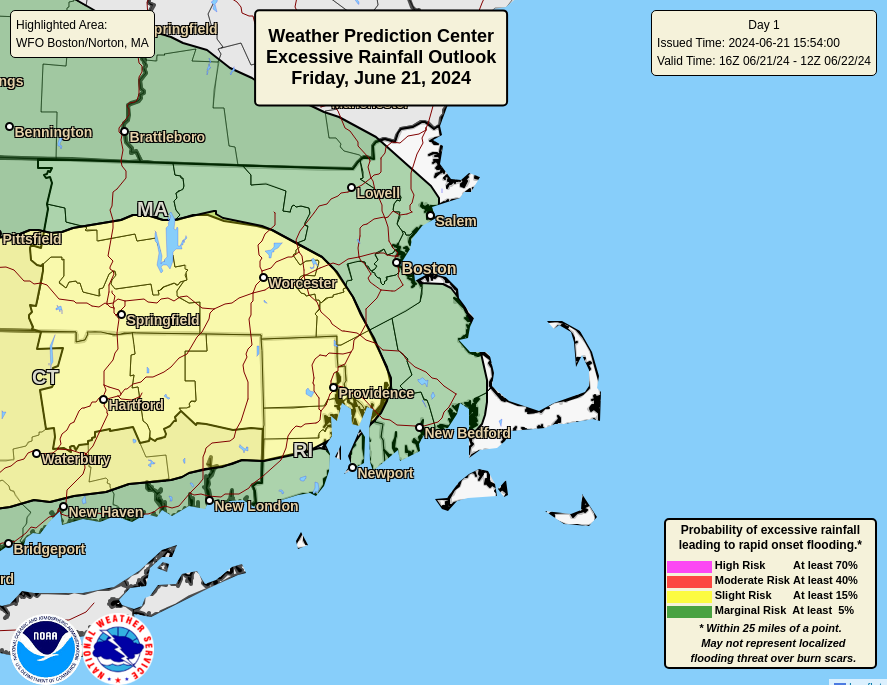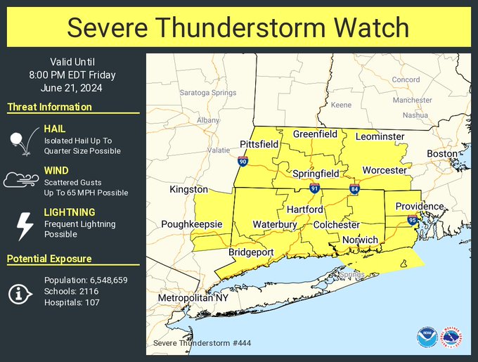 Good afternoon, We wanted to give you a heads up that a Severe Thunderstorm Watch has been issued for the western two thirds of southern New England. *What* ... Severe thunderstorms possible with damaging winds and large hail. Heavy rainfall and localized flooding is possible as well. *When* ... thru 8 pm EDT *Where* ... central and western MA, all of Connecticut and much of Rhode Island (except Bristol and Newport counties) Thanks. Kevin Cadima If you have any questions or would like more information, please don't hesitate to contact us. You can reach us via: email: box.operations@noaa.gov phone: 508.622.3280 Slack/NWSChat 2.0 <https://nwschatws.slack.com/> (for approved partners) social media: Website <http://www.weather.gov/boston> | Facebook <http://www.facebook.com/NWSBoston> | Twitter <http://www.twitter.com/NWSBoston>