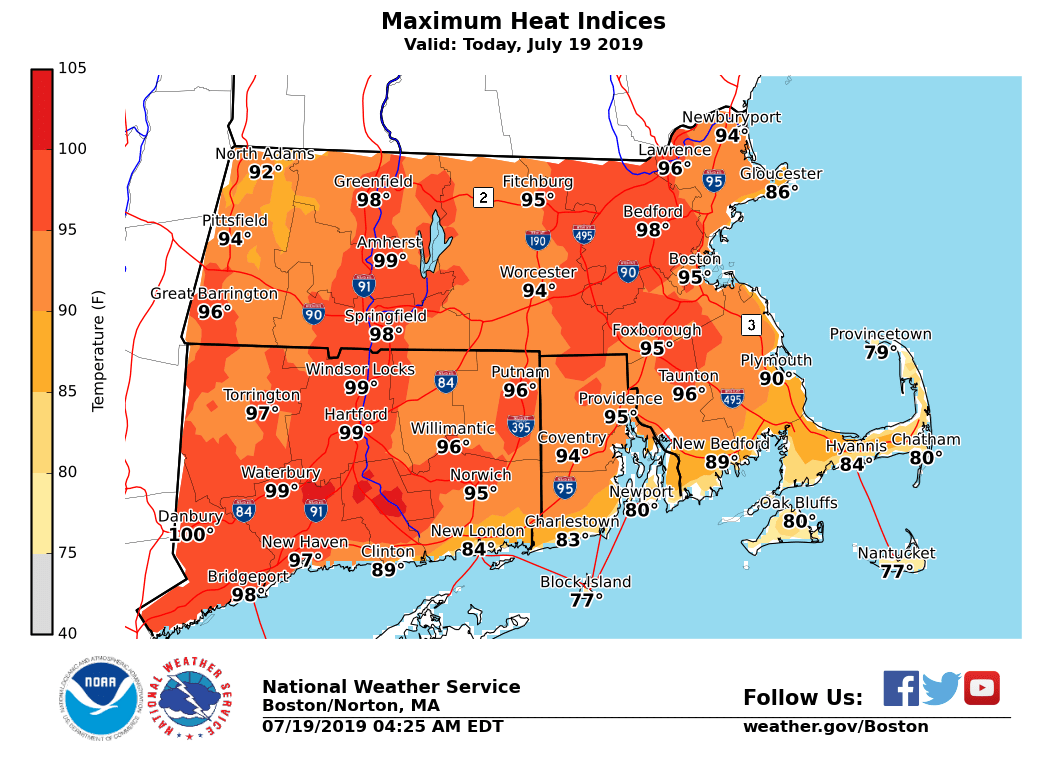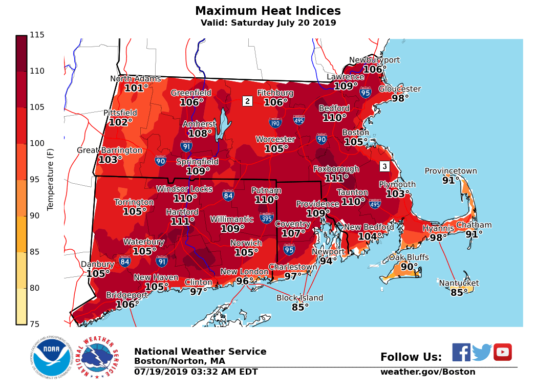 Good morning, While today will start in relative comfort, heat and humidity will be on the increase today and peak on Saturday and Sunday. A cold front then brings relief from the high temperatures Monday and the high humidity Tuesday. Heat index values will approach or even exceed 110 degrees in some locations Saturday and Sunday afternoons. This is dangerous heat and humidity and relatively rare for this part of the country. We have attached an image of the Heat Headlines issued along with the maximum heat index values anticipated Today, Saturday and Sunday. It is not only heat during the day, but the lack of cooling at night which will be a problem. Fortunately, much cooler air arrives Monday. *Headlines ...* - Excessive Heat Warnings continue for most of Massachusetts, Connecticut and Rhode Island. - Heat Advisories continue for Berkshire County, Cape Cod, and Martha's Vineyard. *Changes ... *None. *What ...* - Excessive heat and humidity begins this afternoon and peaks Saturday and Sunday afternoons. - Heat Index Values between 95 and 100 degrees this afternoon. - Heat Index Values between 107 and 112 degrees on both Saturday and Sunday afternoons for most of the region with values between 96 and 102 degrees across Berkshire county, Cape Cod and Martha's Vineyard. *Where ...* - Heat headlines in effect for all of southern New England except Nantucket beginning this afternoon and continuing through the weekend. *When ... * - This afternoon through early Sunday evening. - Much cooler and less humid Monday. If you have any questions or would like more information, don't hesitate to contact us via this email address, on NWSChat <https://nwschat.weather.gov/>, or at the following: National Weather Service Boston/Norton, MA 46 Commerce Way Norton, MA 02766 508.622.3280Websit <http://www.weather.gov/boston> | Facebook <http://www.facebook.com/NWSBoston> | Twitter <http://www.twitter.com/NWSBoston>