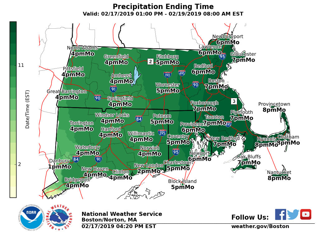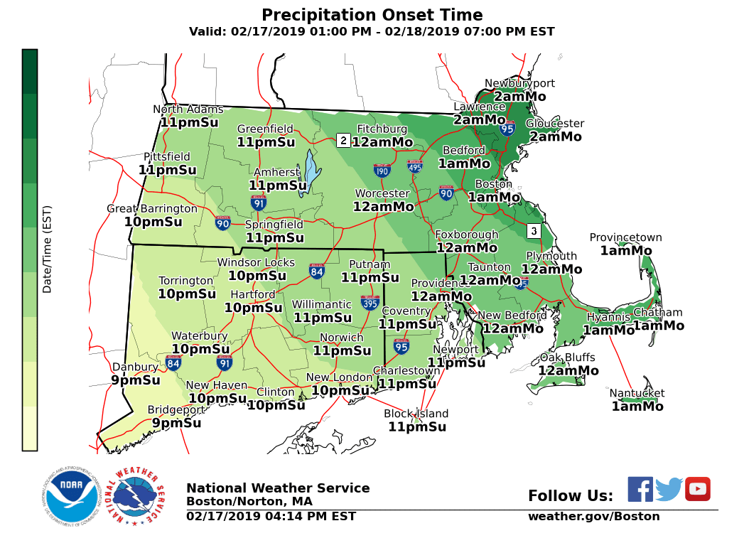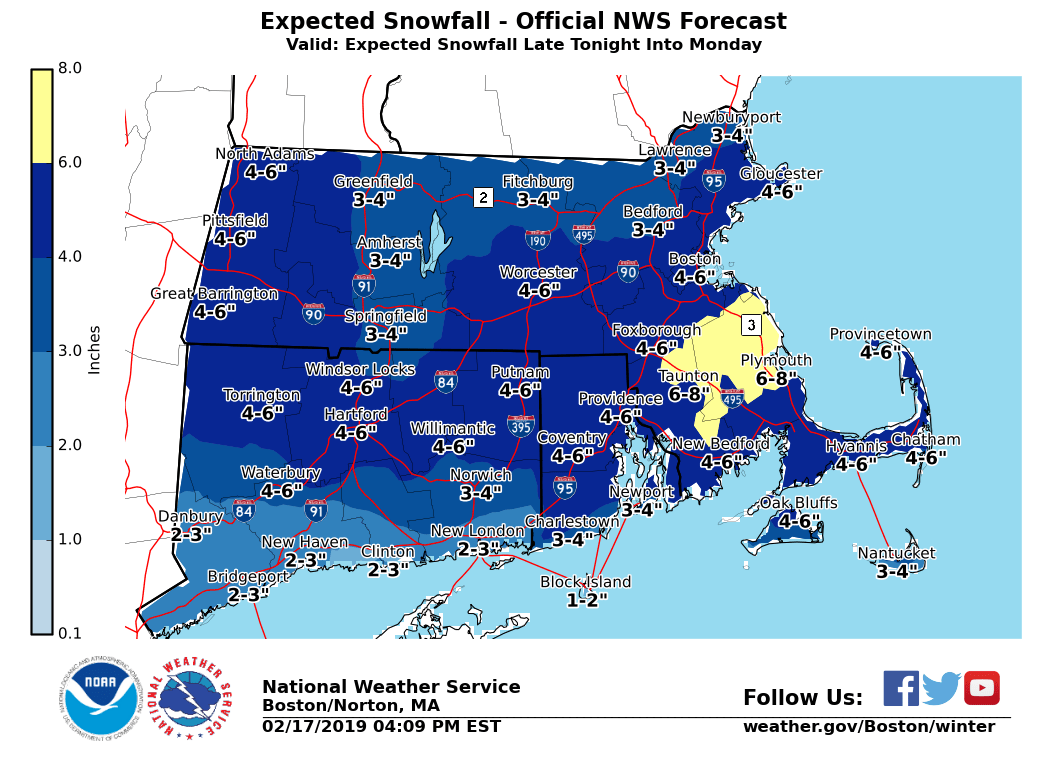 Good afternoon everyone. We have included a brief outline in this email and attached the latest snowfall forecast along with the approximate start and end times. *What has changed:* - Winter Storm Warnings Issued for northern Rhode Island into portions of southeast MA approaching the Cape Cod Canal. 4 to 7 inches of snow expected. - Winter Weather Advisories expanded to include the rest of southern New England for a general 3 to 6 inches of snow. *WHAT: * - A plow-able snowfall is in store for the region. *WHERE: * - All of Massachusetts, Rhode Island and Connecticut *WHEN: * - Snow is expected to overspread the region from southwest to northeast between 9 pm and 2 am Monday morning. - The heaviest snow will fall after midnight through about 9 am Monday morning near and especially south of the Massachusetts turnpike. - Lighter snows will continue later Monday morning and afternoon, but bands of heavier snow will impact central and eastern Massachusetts at times. *POTENTIAL IMPACTS:* - Roads will become snow covered/slippery along with reduced visibility for the Monday morning commute particularly near and especially south of the MA turnpike (although more limited given the Holiday). - Greatest risk for snow and slippery roads during the Monday afternoon/early evening commute will be across central and eastern MA, where the ending time will be the latest. *UNCERTAINTY:* - High confidence in a general 3 to 7 inches of snow across the region. Greatest risk for higher amounts will be across portions of RI into southeast MA. - If the low tracks further south amounts will be on the lower end of those numbers, while if it ends up a bit further north snow amounts will be on the higher end. - Snow amounts on the immediate south coast, Cape and Islands are subject to change by a few inches dependent on how far north the rain/sleet line gets into the region. Please let us know if you have any questions or concerns. Thank You Meteorologist: Hayden Frank If you have any questions or would like more information, don't hesitate to contact us via this email address, on NWSChat <https://nwschat.weather.gov/>, or at the following: National Weather Service Boston/Norton, MA 46 Commerce Way Norton, MA 02766 508.622.3280 Website <http://www.weather.gov/boston> | Facebook <http://www.facebook.com/NWSBoston> | Twitter <http://www.twitter.com/NWSBoston>