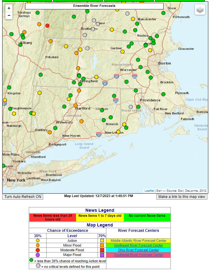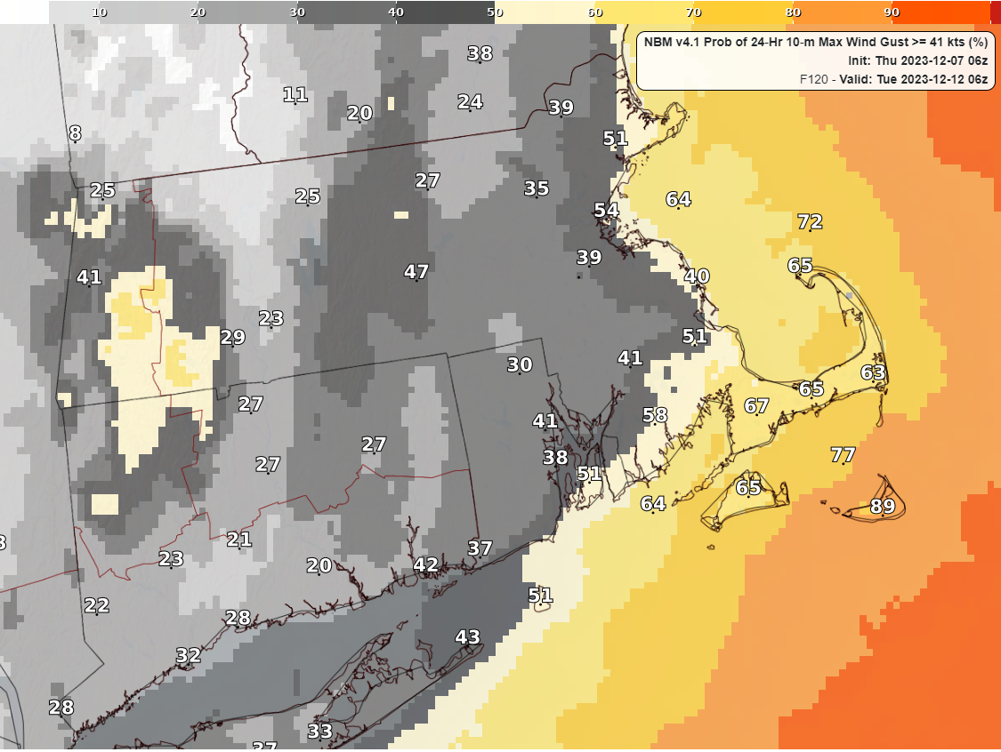 Good Afternoon, We are closely evaluating the expected development of a strong storm system that will impact southern New England late Sunday into Monday -- with increasing probability that it will produce a period of strong wind gusts of 45-60 mph, locally heavy rainfall and perhaps some minor coastal flooding. More information is provided in the 1-Pager briefing that is attached, and we will be working to determine more of the details in the coming couple of days. Also attached to this email are two separate images. 1) Current probability of wind gusts exceeding 45 mph. The point probability values are plotted on the map, though the yellow and orange shaded areas denote where the current chances of seeing those strong wind gusts are above 50%. 2) A snapshot from our Ensemble River Forecast <https://www.weather.gov/erh/mmefs>system. Of note are the locations with orange circles which represent a 30% chance of a river reaching minor flood stage. These outlooks will likely change in the coming days as the rainfall forecasts from computer models converge on a most likely outcome. Thought this link would be helpful for some of you. At this point, we are not planning on issuing another briefing until tomorrow (Friday) afternoon. Andy Nash, Kevin Cadima, Bryce Williams and Kyle Pederson If you have any questions or would like more information, please don't hesitate to contact us. You can reach us via: email: box.operations@noaa.gov phone: 508.622.3280 Slack/NWSChat 2.0 <https://nwschatws.slack.com/> (for approved partners) social media: Website <http://www.weather.gov/boston> | Facebook <http://www.facebook.com/NWSBoston> | Twitter <http://www.twitter.com/NWSBoston>